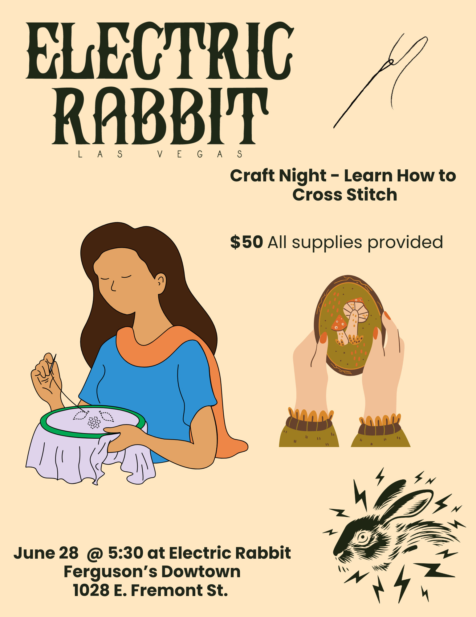 Electric Rabbit: Craft Night - Learn to Cross Stitch Sunday, June 28, 2026 5:30 PM 7:00 PM Fergusons Downtown 1028 Fremont Street Las Vegas, NV, 89101 United States (map) Google Calendar ICS
