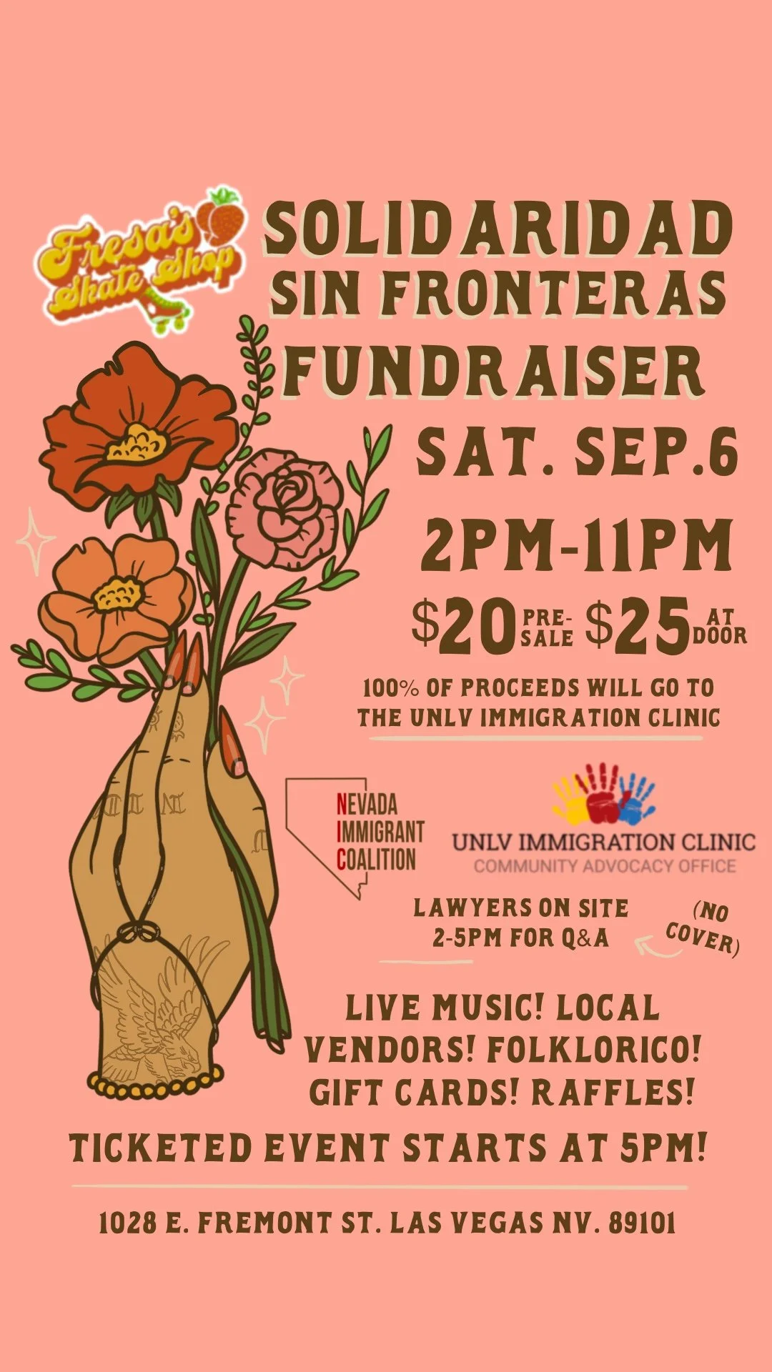 Fresa’s Skate Shop: Solidaridad Sin Fronteras Fundraiser Saturday, September 6, 2025 2:00 PM 11:00 PM Fergusons Downtown 1028 Fremont Street Las Vegas, NV, 89101 United States (map) Google Calendar ICS