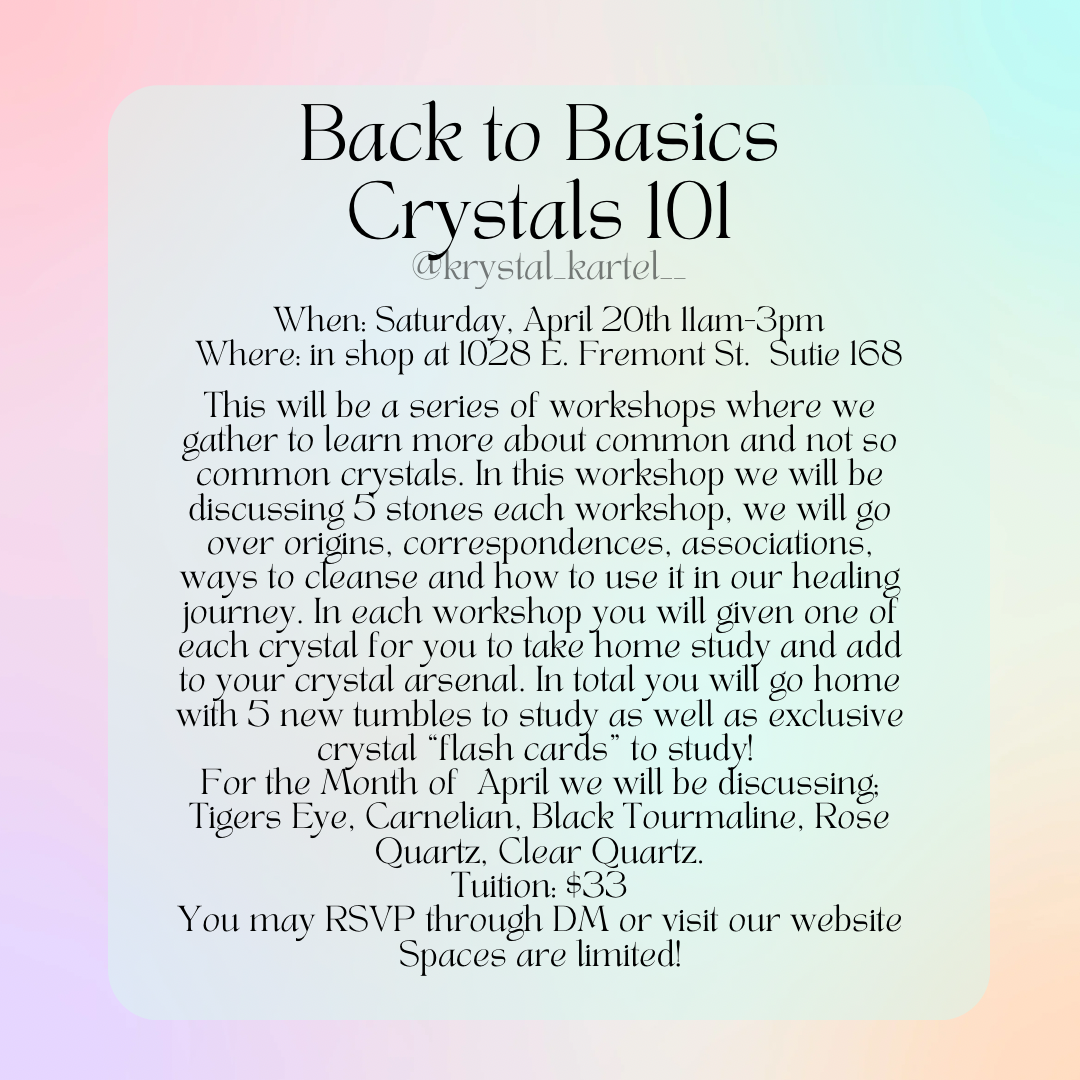 Krystal Kartel: Back to Basics Crystals 101 Saturday, April 20, 2024 11:00 AM 3:00 PM Fergusons Downtown 1028 Fremont Street Las Vegas, NV, 89101 United States (map) Google Calendar ICS RSVP